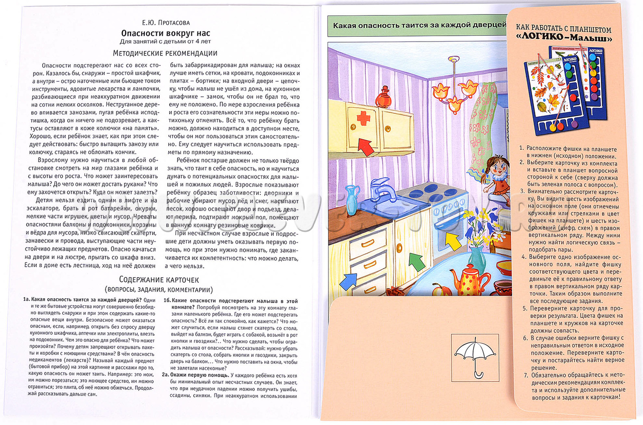 Задания комплекта направлены на обучение ребёнка предвосхищать (предупреждать) опасные ситуации и закреплять алгоритм действий, если все-таки произошёл несчастный случай или происшествие. В процессе решения заданий комплекта дети научатся анализировать возможную опасность, которую могут таить в себе повседневные, с виду безобидные предметы, или ситуации которые могут привести к нежелательным и опасным последствиям. Примеры заданий в карточках: 1б. Какие опасности подстерегают малыша в этой комнате? 2а. Окажи первую помощь. 2б. Предупреди бабушку с дедушкой об опасности. 4б. Что случилось в этой комнате? 7а. Какую опасность таят эти предметы?