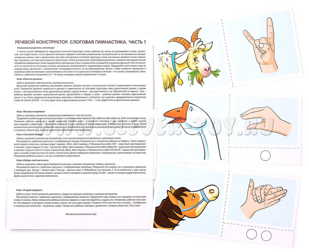 "Речевой конструктор. Слоговая гимнастика. Часть 1" - это комплект из 12 листов, включающих 34 карточки и 5 игр.