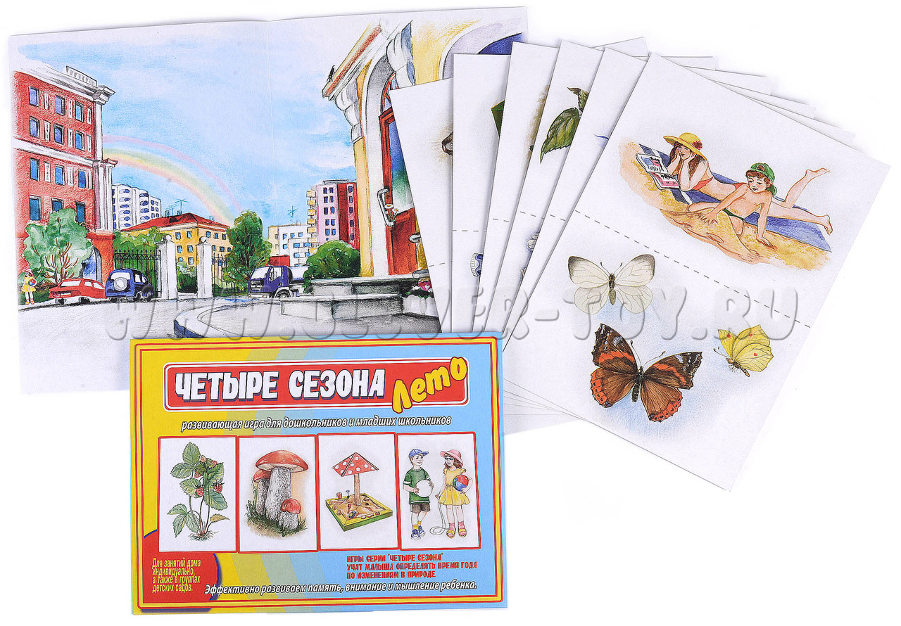 Времена года (с 4 лет). Перед ребёнком выкладывают карточки из разных серий (количество зависит от возраста) и 4 городских пейзажа. Задача- разложить все карточки по 4 временам года.