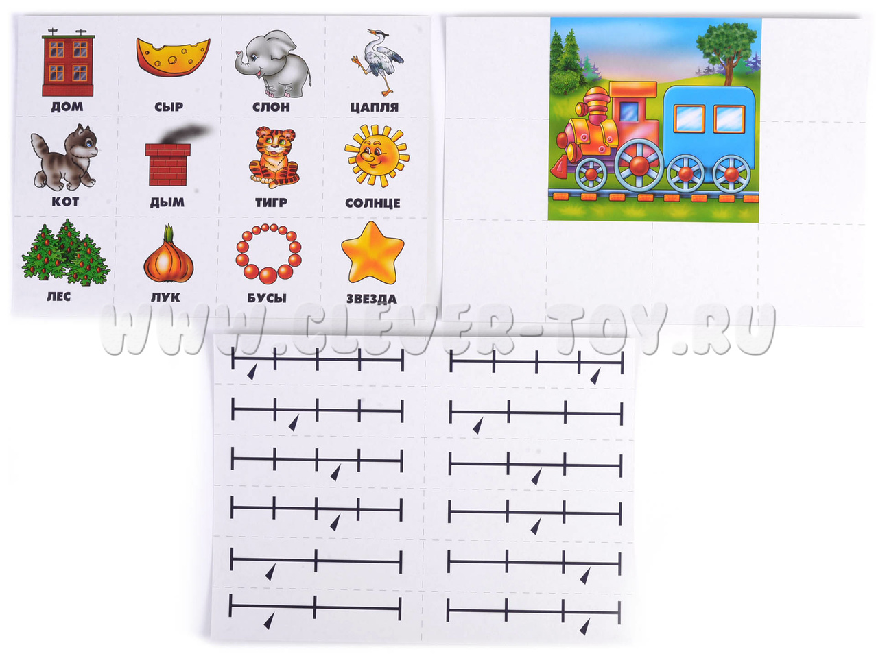 2. Раскладываем карточки со словами на больших картах по вагончикам (например, если вагончик с 3 окошками - слова из 3 слогов).