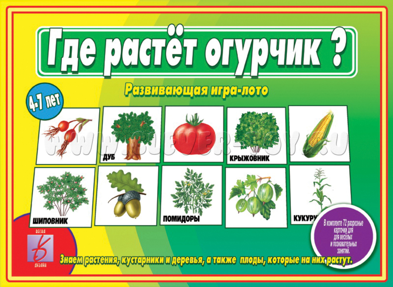 "Где растет огурчик?" – развивающая карточная игра-лото, созданная для активного развития детей возрастом от 4 до 7 лет. Игра нацелена на расширение кругозора ребенка и усвоение им знаний о различных растениях и плодах, которые на них растут, расширение активного словарного запаса, формирование грамотной связной речи и коммуникативных навыков.