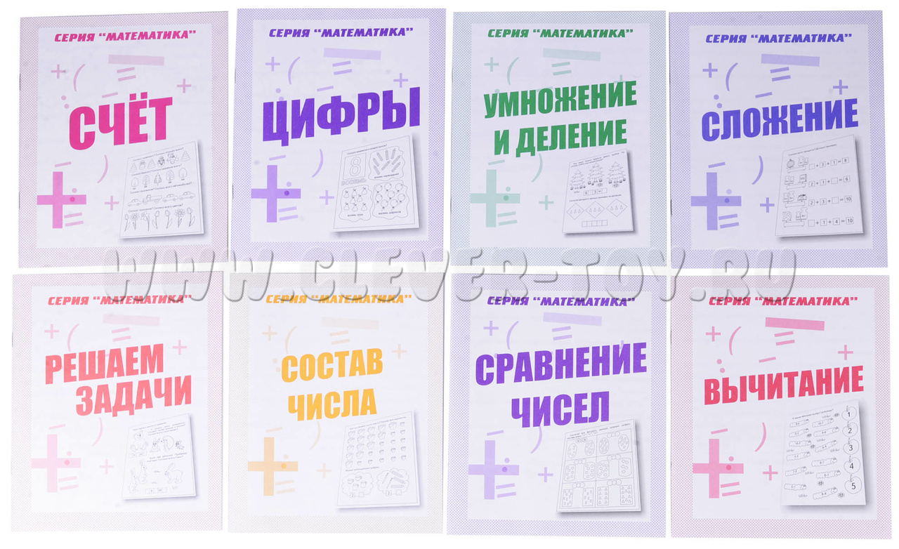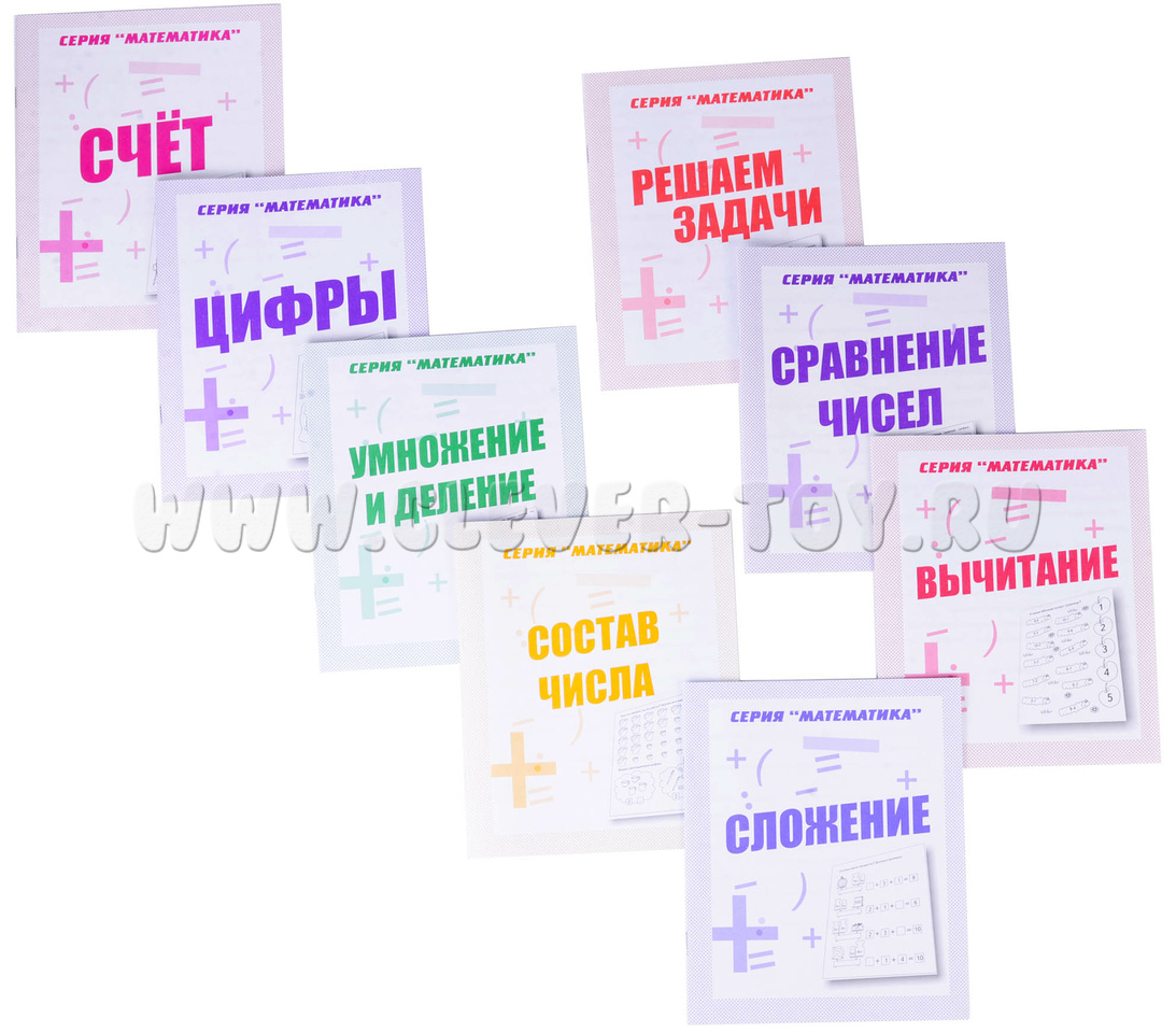 В состав комплекта входит 8 тетрадей, каждая из которых посвящена определенному математическому умению дошкольника. В тетрадях по 32 страницы.