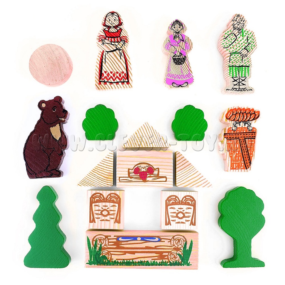 В набор входят деревянные модели персонажей и декорации сказки "Маша и медведь" (всего 15 деталей), а также вкладыш с текстом сказки.