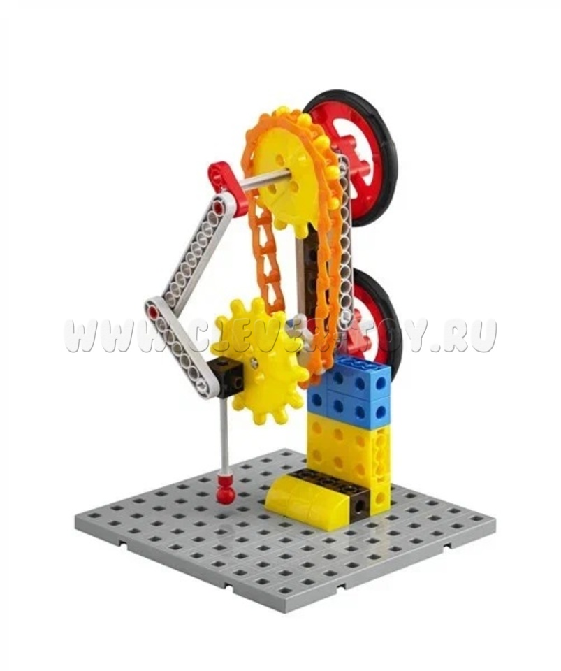 Набор включает в себя 181 деталь (шестеренки, колеса, оси, цепи, кубики, основание для кубиков и др.), а также инструкция на англ. яз. Размер самой длиной детали 9 см.