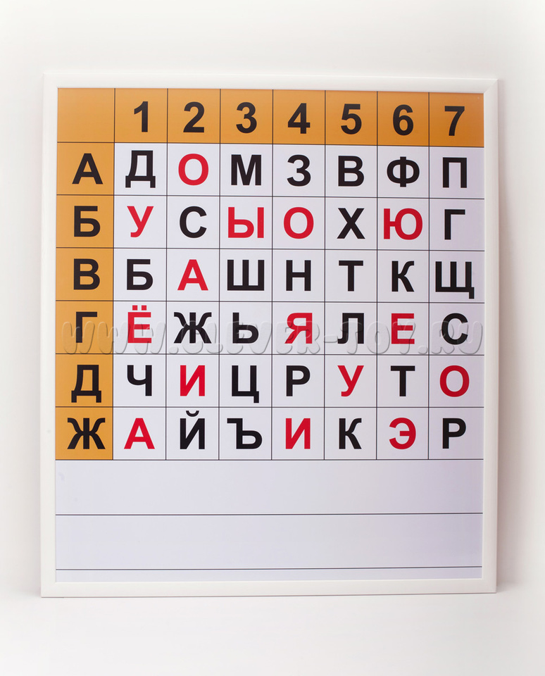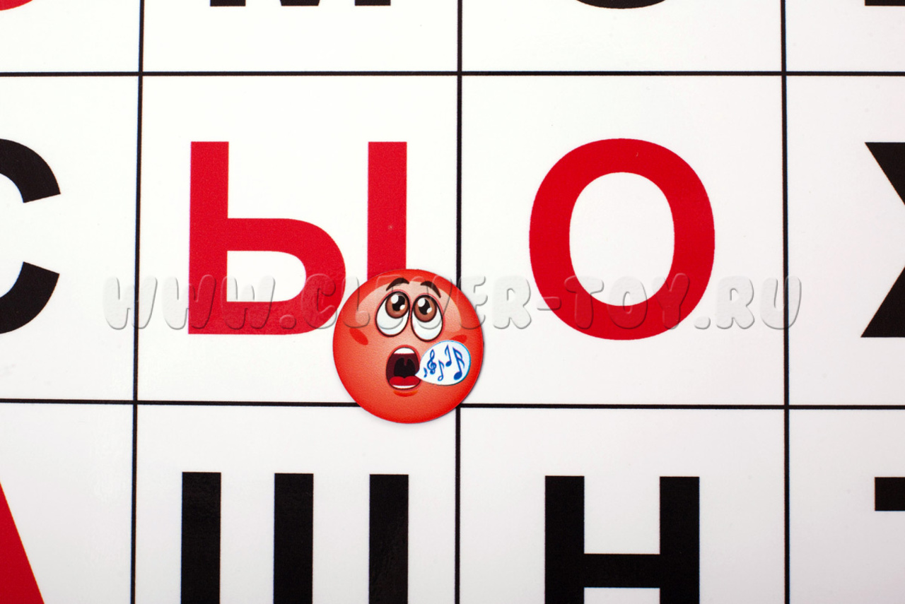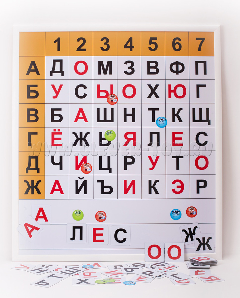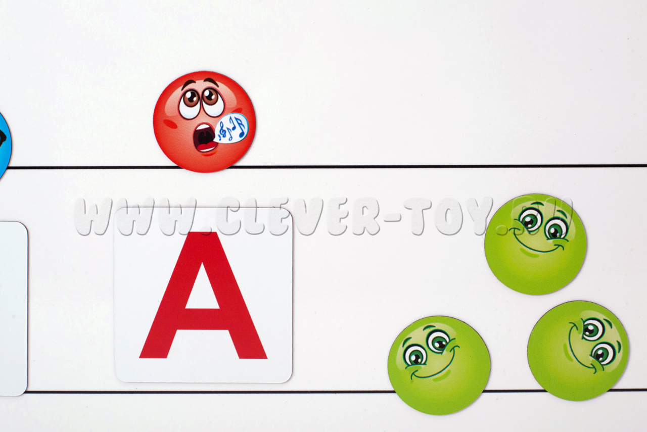 В комплекте с доской поставляются 71 карточка с буквами, чтобы составлять слова и делать их звуковой анализ и одна пустая карточка, на которой, например, можно написать любую букву. А также специальные разноцветные смайлики, которые помогают превратить фонетический разбор даже самого сложного слова в увлекательную игру - по 10 штук красного, синего и зелёного цвета.
