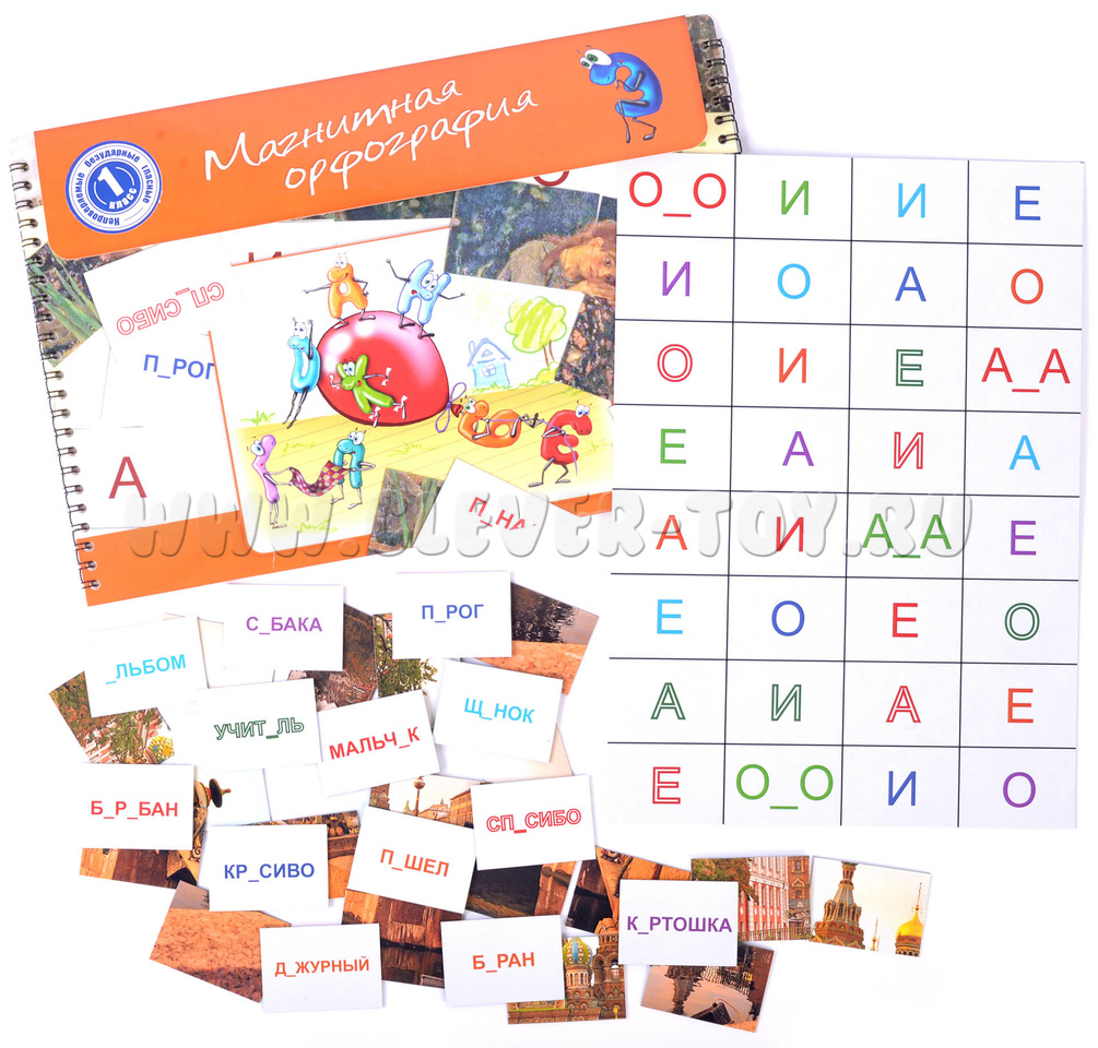 Учим словарные слова без скучной зубрёжки. На игровом поле - разноцветные магнитные буквы, каждая со своим характером. На карточках - слова с пропущенными буквами. Задача ребёнка: найти нужную букву и правильно дополнить слово.