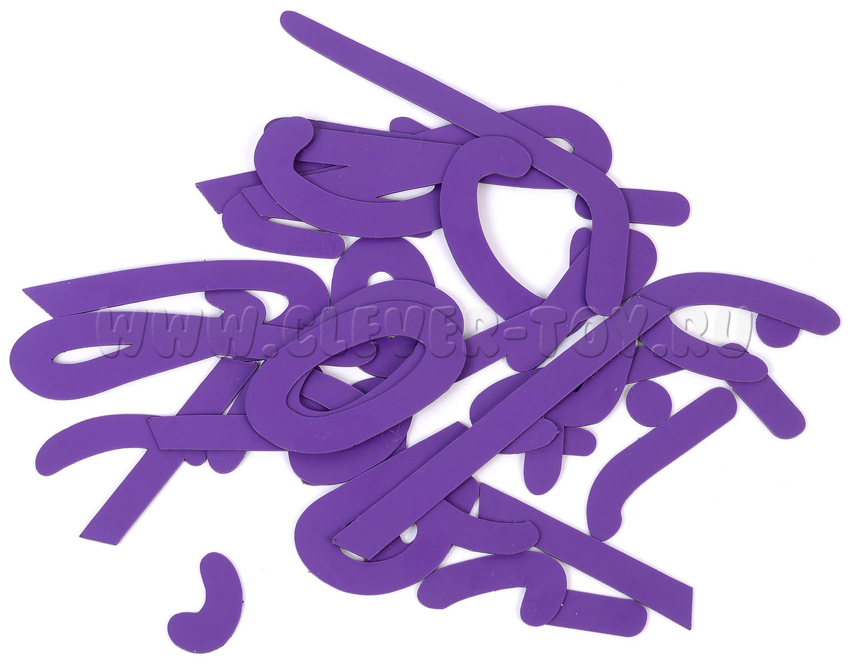 Элементы букв выполнены в 2-х цветах: Строчные выполнены в темно-фиолетовом цвете; Прописные в сиреневом.
