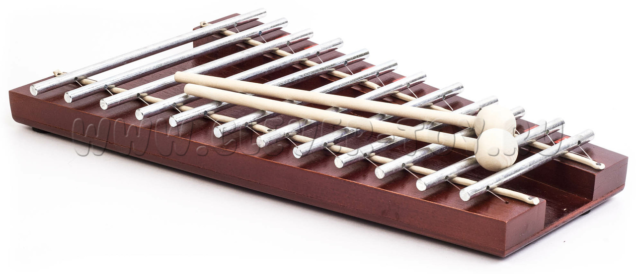 Металлофон изготовлен из 12 стальных прутков диаметром 6 мм, которые крепятся к резонатору. После закалки и гальванической обработки металл имеет мягкий, певучий и благозвучный голос.
