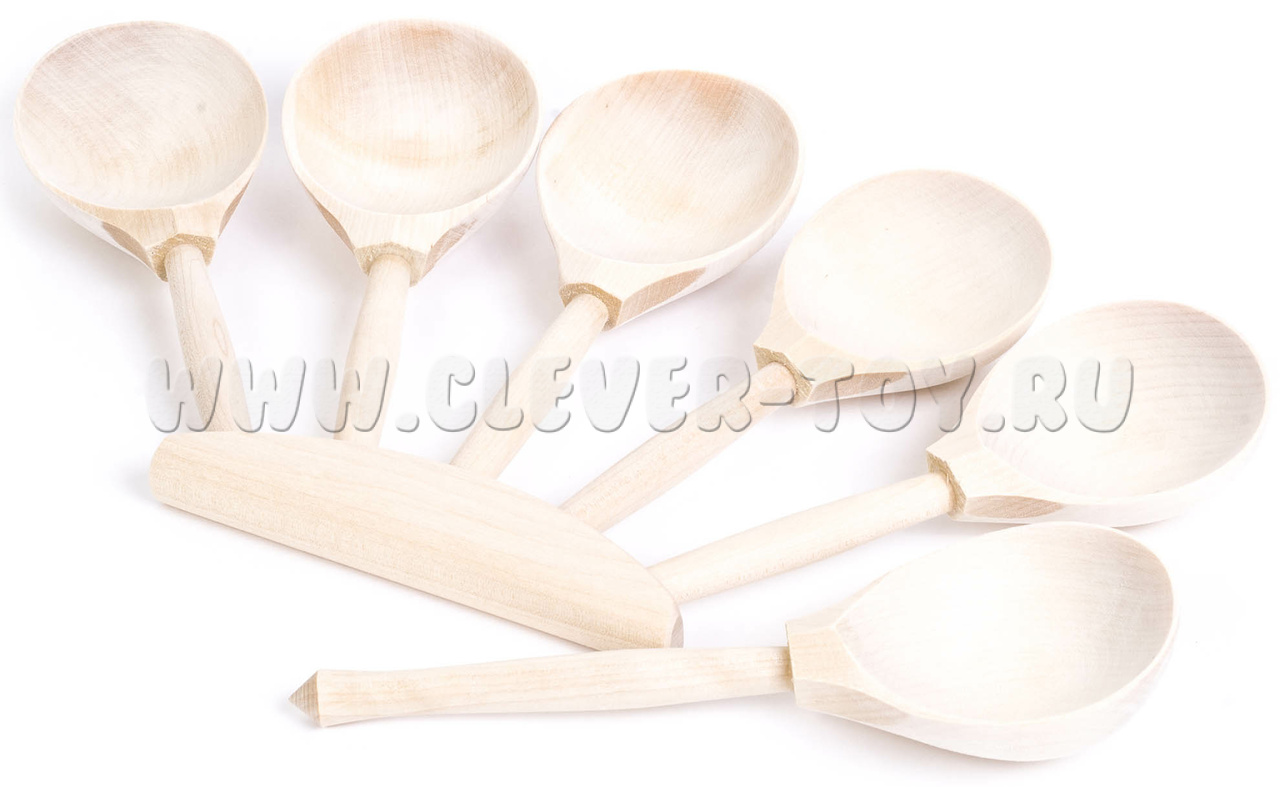 Пять деревянных ложек закреплены на бруске. Толщина бруска 15 мм, длина 130 мм, ширина 30 мм. На бруске ложки располагаются под углом в 22 градуса и на расстоянии 35 мм друг от друга. В основание бруска ложки крепятся с помощью клея. В комплект музыкального инструмента входит еще одна ложка - игровая. Представляет собой обычную музыкальную ложку. Материал: береза.