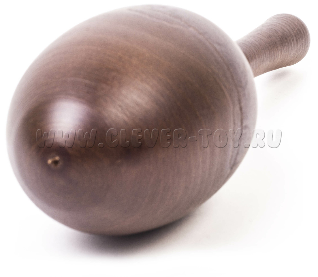 Погремушка представляет собой пустотелый деревянный предмет яйцеобразной формы. Внутрь погремушки засыпана охотничья дробь. В нижней части погремушки крепится фигурная ручка токарной работы. Материал: липа.