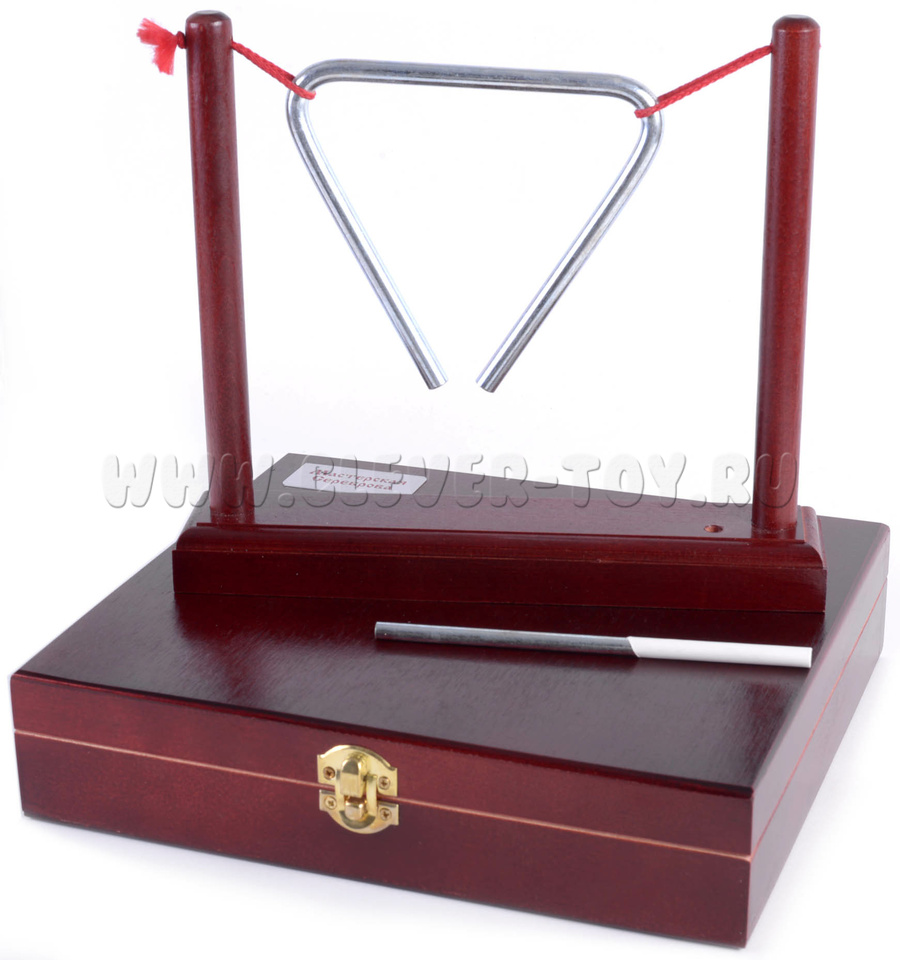 Треугольник выполнен из стали диаметром 8мм, длина стороны - 12см. Гальваническое покрытие не ухудшает качество звука и не разрушается при механическом воздействии. Треугольник закреплен на деревянном основании. Ударная палочка из нержавеющей стали. Подарочный кейс с золочеными застежками.