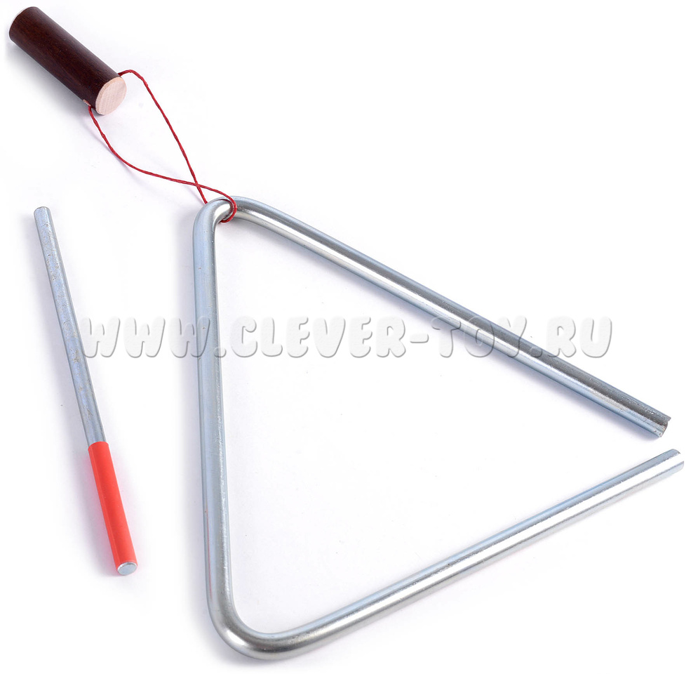 Треугольник выполнен из стали диаметром 8мм, длина стороны - 18см. Гальваническое покрытие не ухудшает качество звука и не разрушается при механическом воздействии. Ударная палочка из нержавеющей стали.