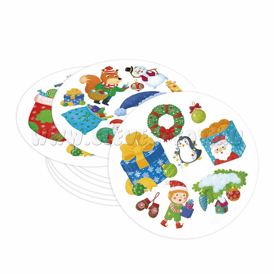 В состав игры входит 57 круглых карточек. На каждой карточке вперемешку изображены 8 символов – всё, что связано с любимым праздником - Новым Годом! Например: пакет с мандаринами, Дед Мороз с ёлкой, месяц в шапочке, снежный шар, енотик в тёплом свитере, птичка, горячий часй с тортом и т.д. Карточки выполнены из плотного картона. Рисунки яркие, крупные, привлекающие внимание детей.