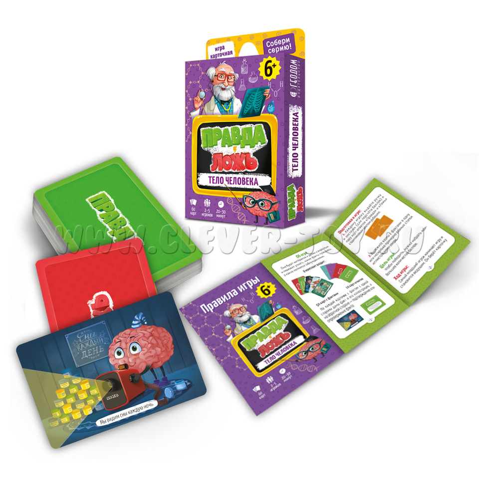 Эта карточная игра – находка для любознательных детей и их родителей! На карточках 50 интересных фактов о теле человека и великолепные иллюстрации с юмором. Задача - разобраться, где правда, а где ложь.