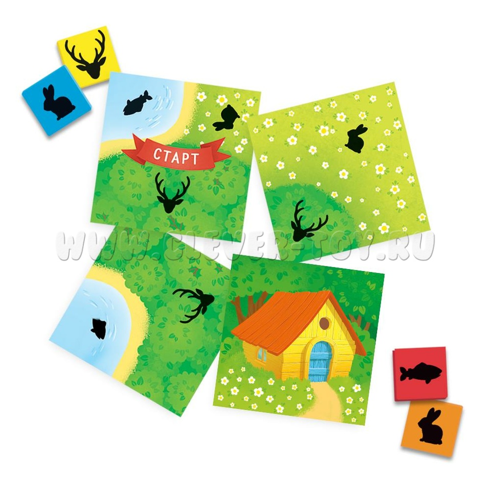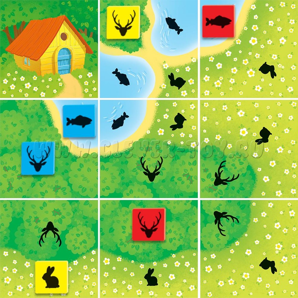 • 36 жетонов животных (заяц, олень, рыбка, разделены на 4 цвета синий, оранжевый, красный, жёлтый);