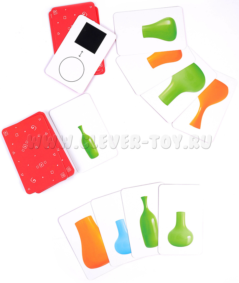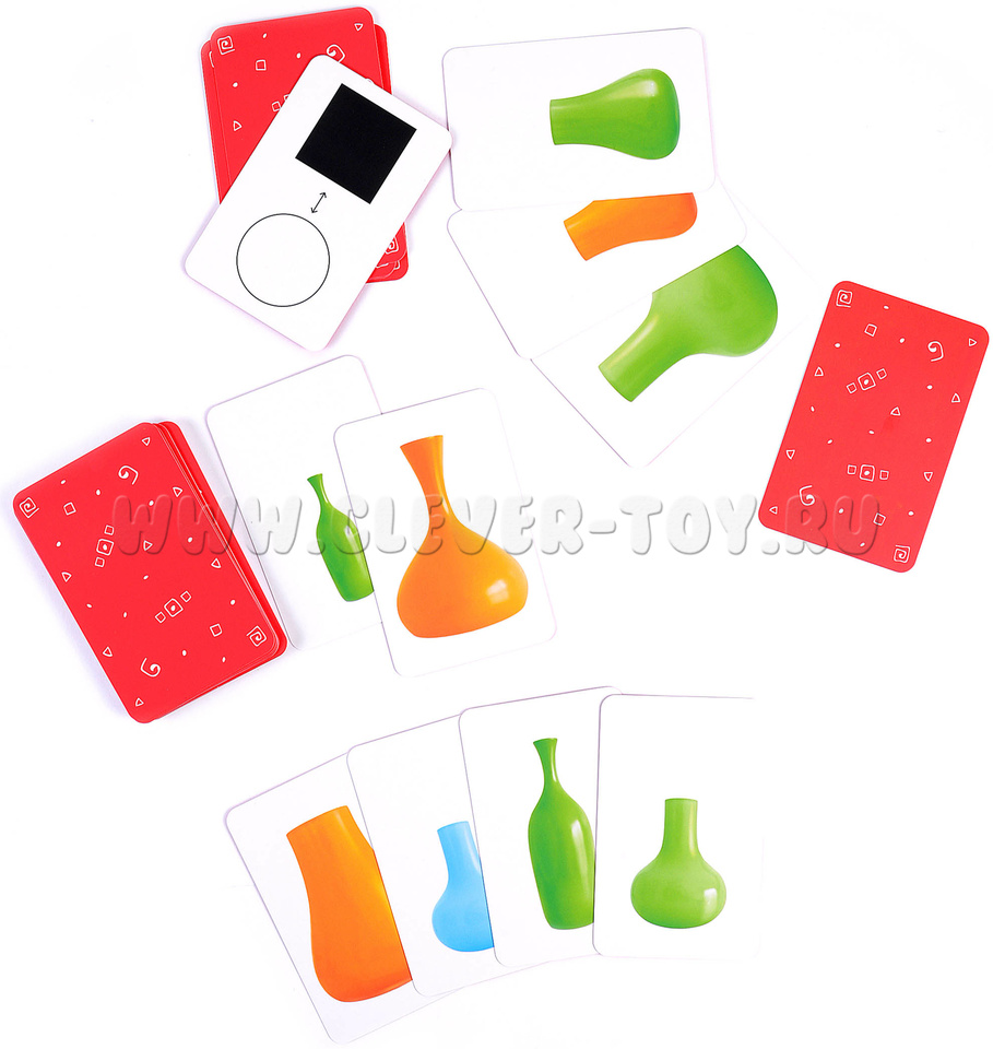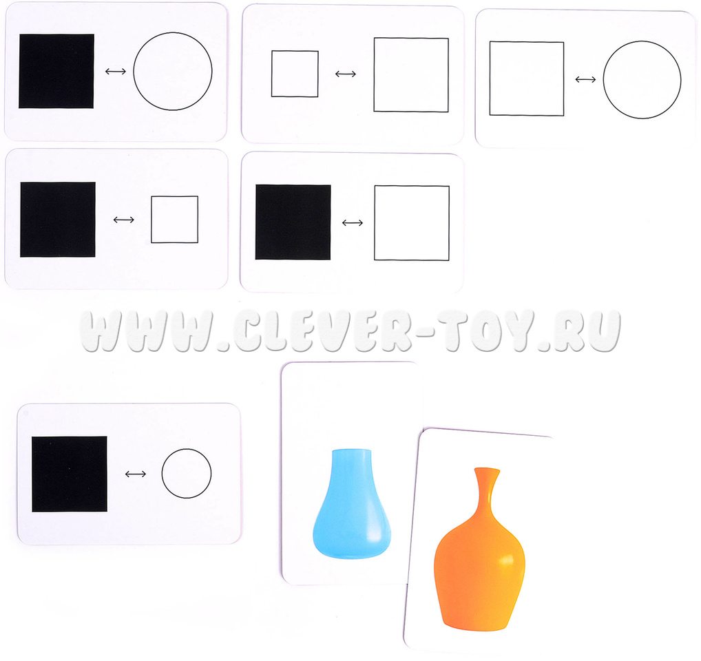 В набор входит 6 черно-белых карточек с символично обозначенными заданиями, инструкция и 30 цветных карточек с изображениями ваз, отличных друг от друга по форме, цвету и размеру.