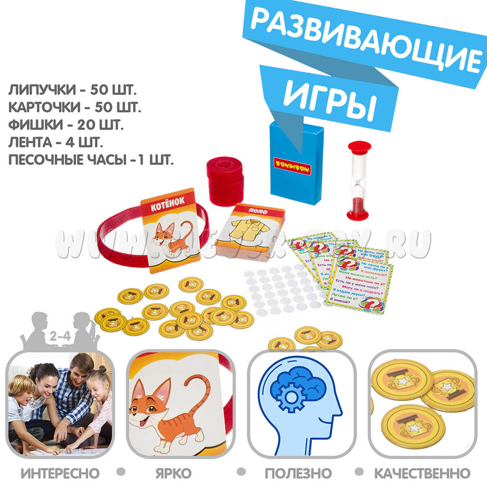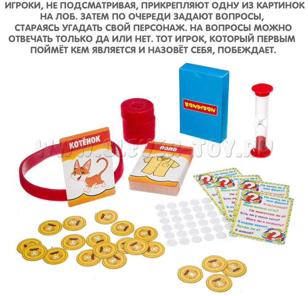 Всемирно популярная игра "Кто я?", в которой нужно угадать "кто-что" изображено на картинке, находящейся на лбу, задавая наводящие вопросы, а в ответ получая только "да" или "нет". Эта версия игры рассчитана на 2-4 человек и предусматривает режим "на время".