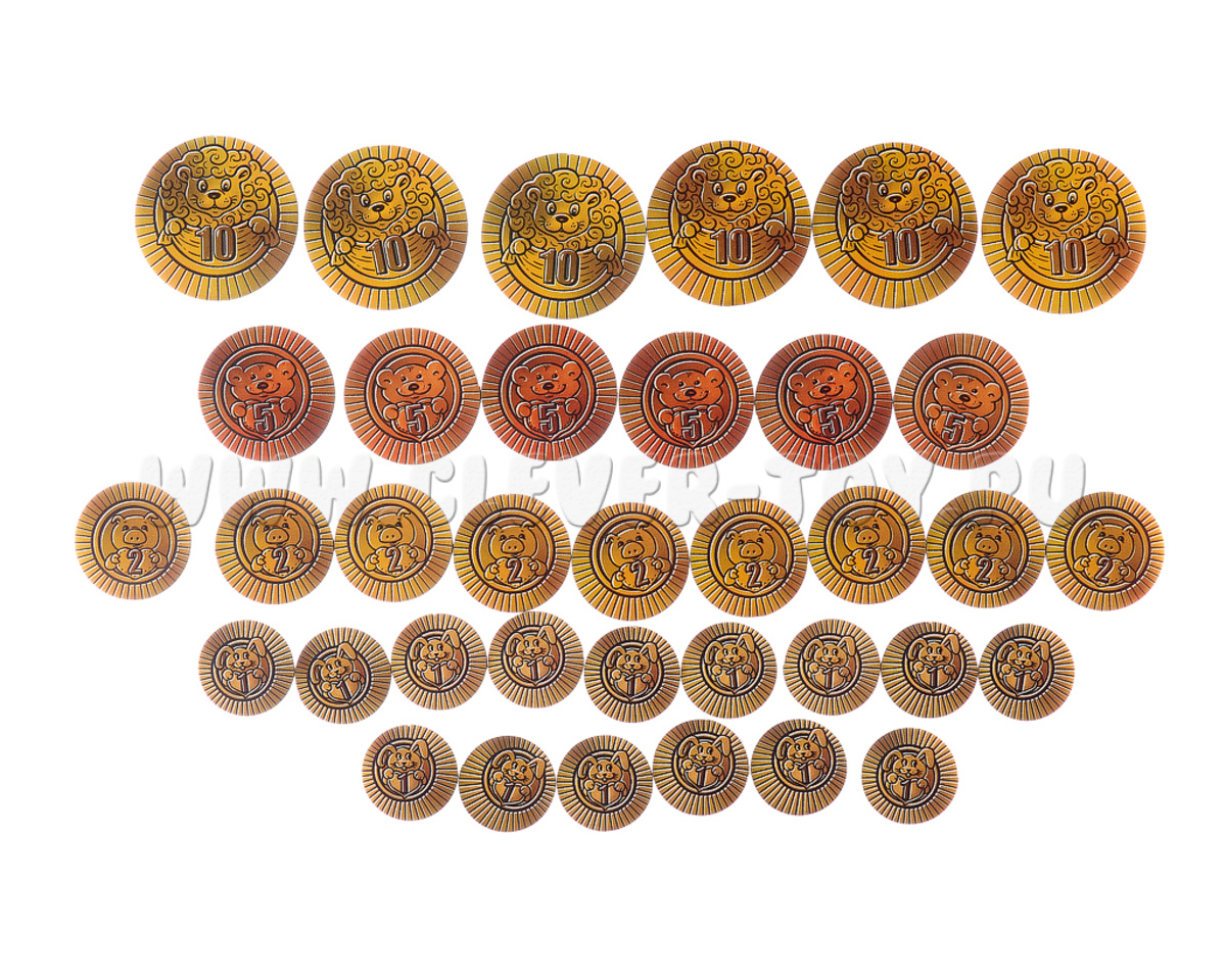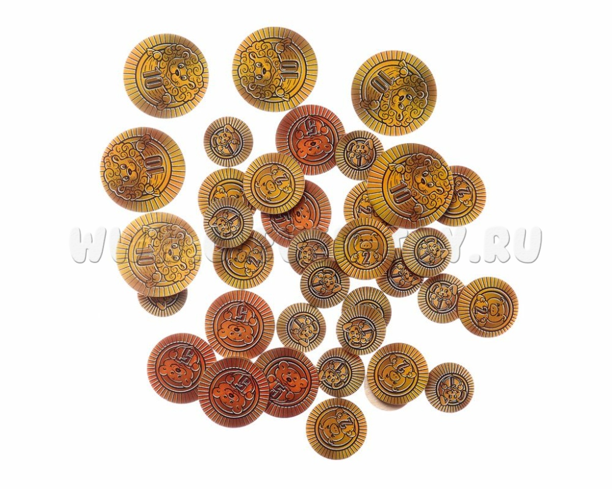 Набор из 18 деревянных монет для обучения и игры. Размер монет: 2-3,5 см. Изготовлены из фанеры с качественной печатью.