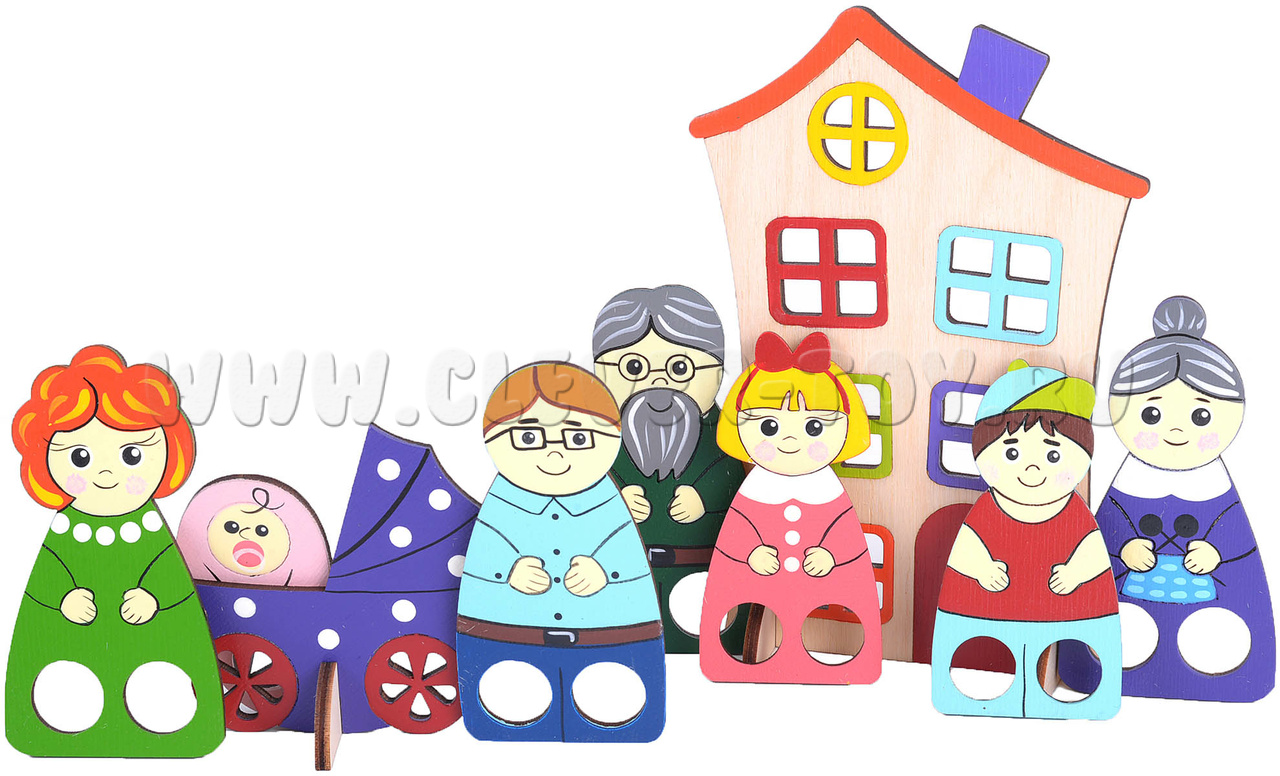 Размеры фигурок: домик 175*115 мм, самые большие фигуры (мама, папа, бабушка, дедушка) 100 мм, самая маленькая фигура (ребёнок) 70 мм.
