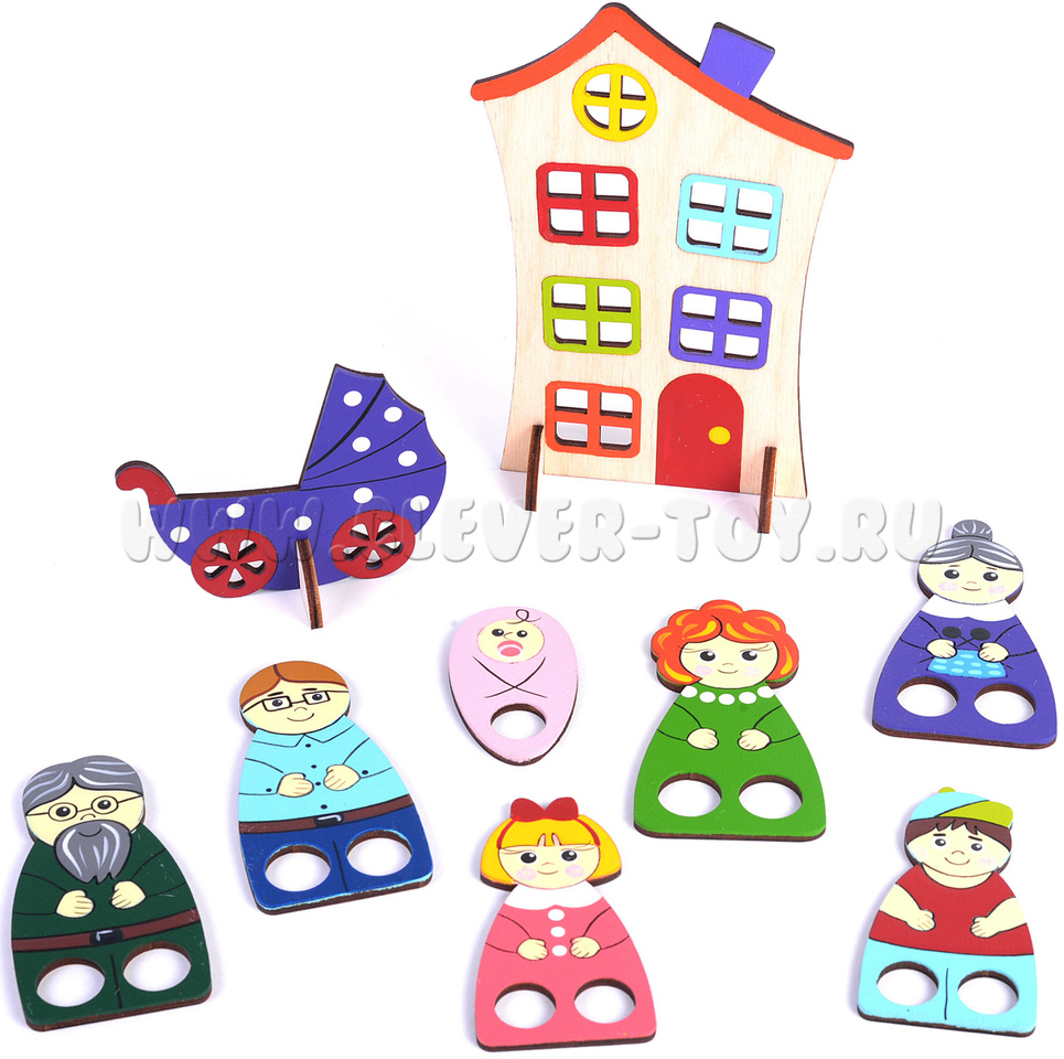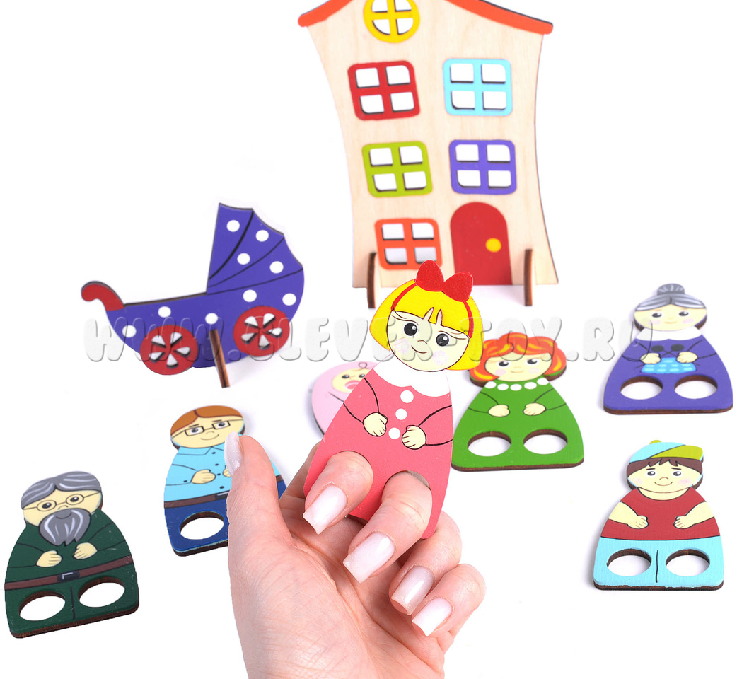 • 7 фигурок-персонажей, которые легко надеваются на пальчики (бабушка, дедушка, мама, папа, малыш, мальчик и девочка).