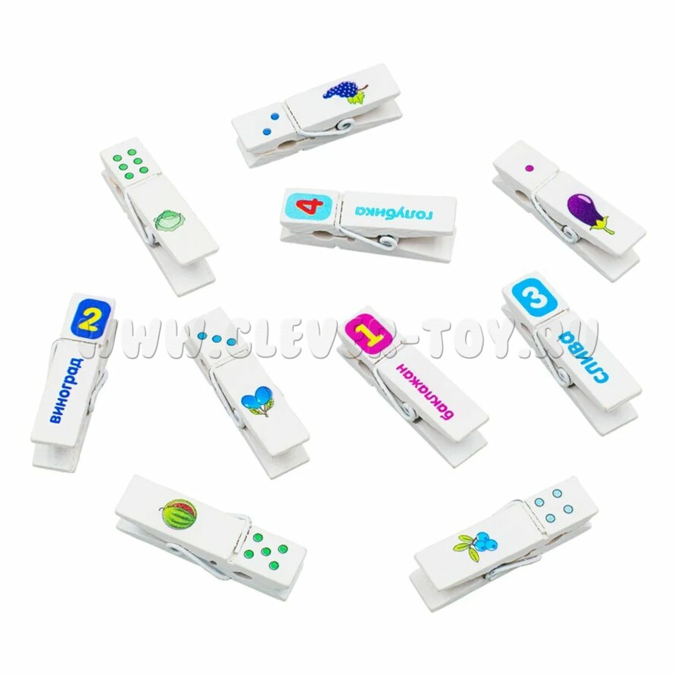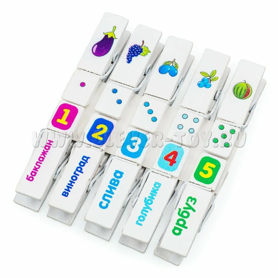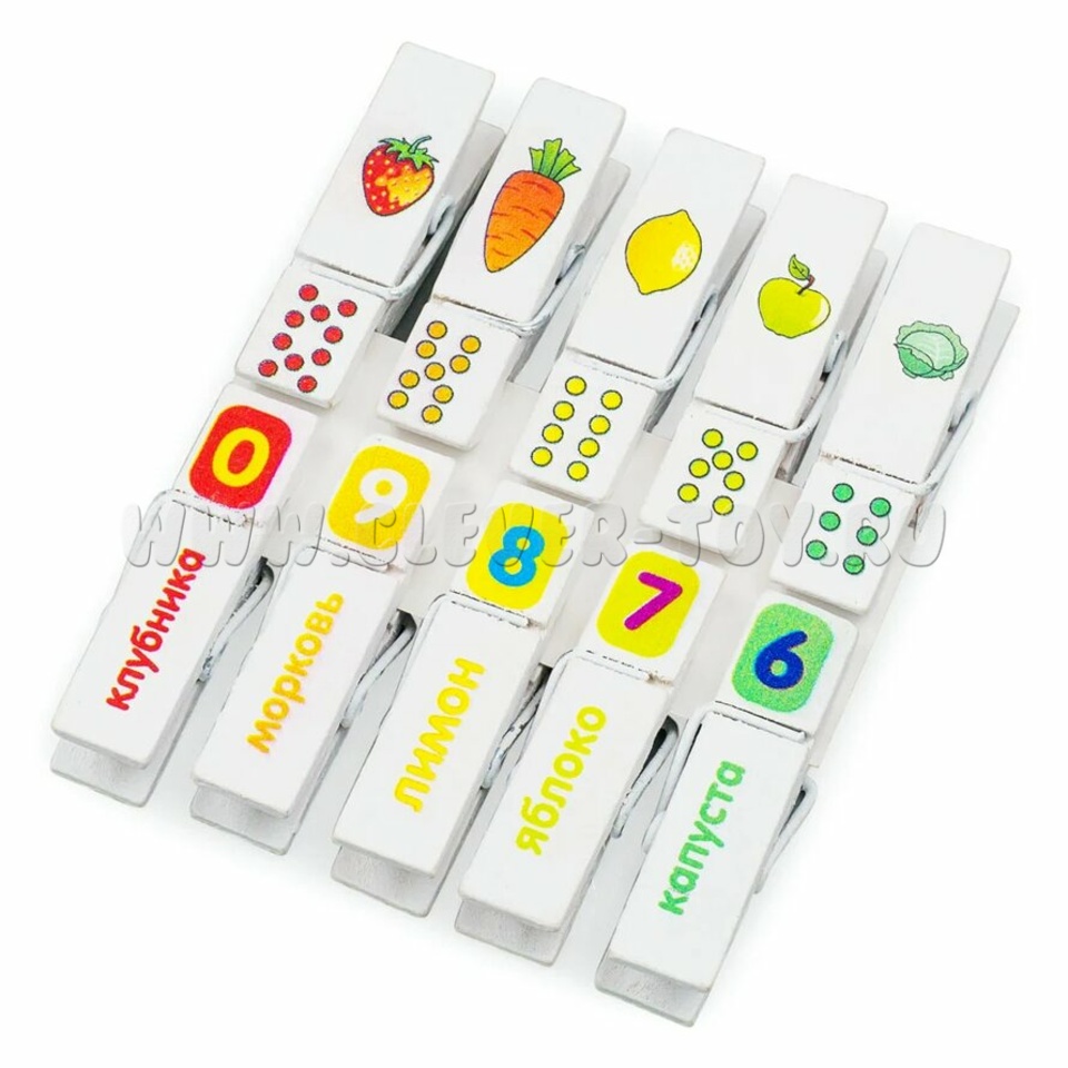 Набор для развития мелкой моторики и навыков счета состоит из 10 прищепок с напечатанными цветными изображениями: фрукты, цвета и цифры.