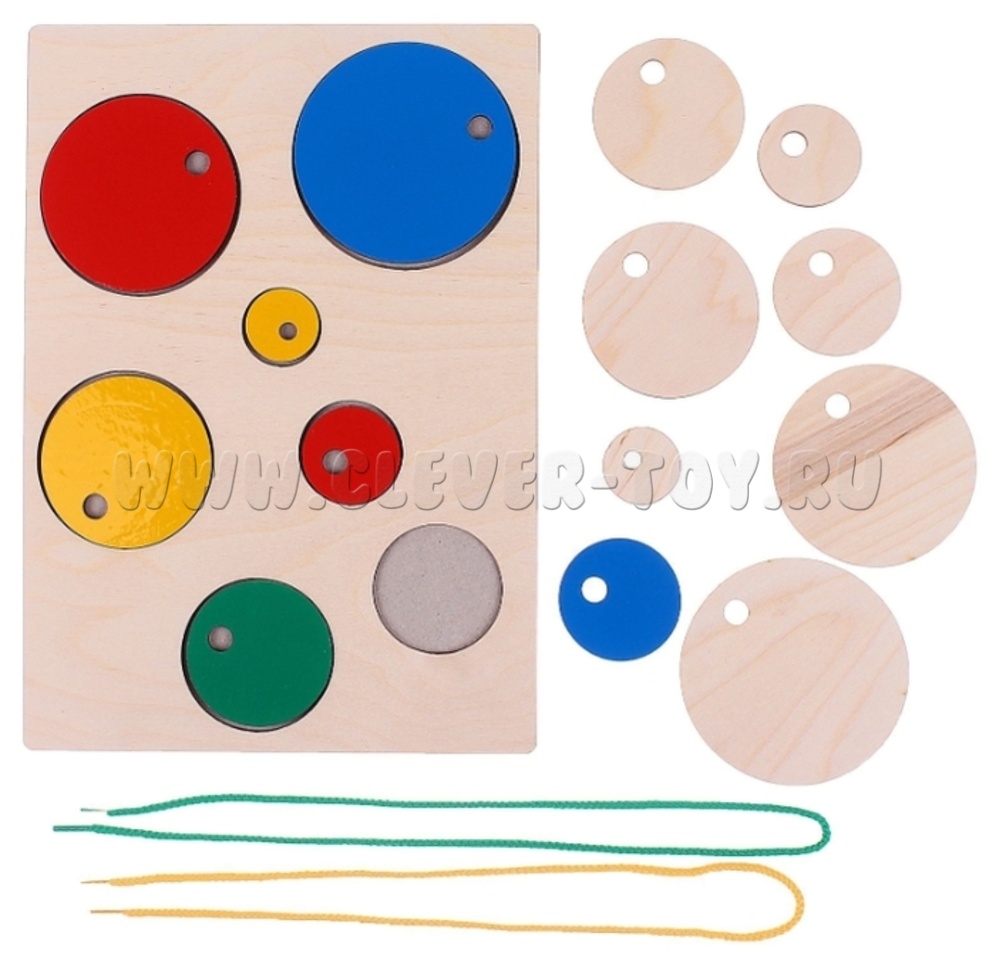 Планшет в который вкладываются разноцветные вкладыши в форме круга. Вкладыши окрашены в разные цвета и имеют разный размер, в каждом есть отверстие для продевания шнурков. Шнурки прилагаются к игре.