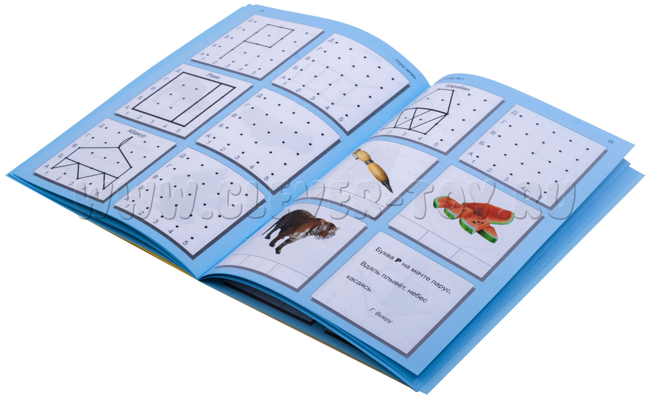 Во второй рабочей тетради приведены задания для ознакомления с согласными: Б, З, Д, Г, Ш, Ж, Л, Н, Р, Ф,Ц, Ч, Щ