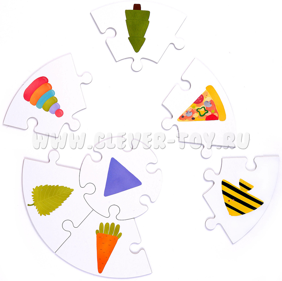 1. Игра на стороне с белым фоном. Разложите на столе круглые центральные части головоломок, остальные элементы перемешайте. Предложите малышу подобрать к каждой серединке 6 подходящих элементов и сложить пазл. Для проверки можно использовать обратную сторону пазла - если все кусочки собраны верно, на оборотной стороне будут нарисованы одинаковые предметы;