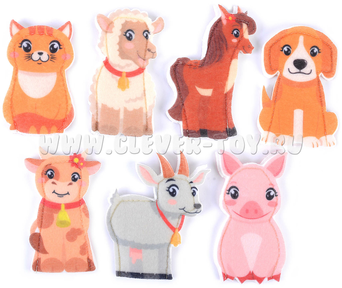 Набор пальчикового театра состоит из: 7 фигурок (размер: 9 см) с изображением домашних животных (собака, лошадь, кот, свинья, коза, овца, корова) и инструкции с описанием игр.