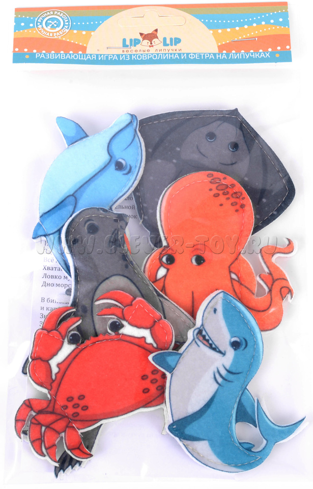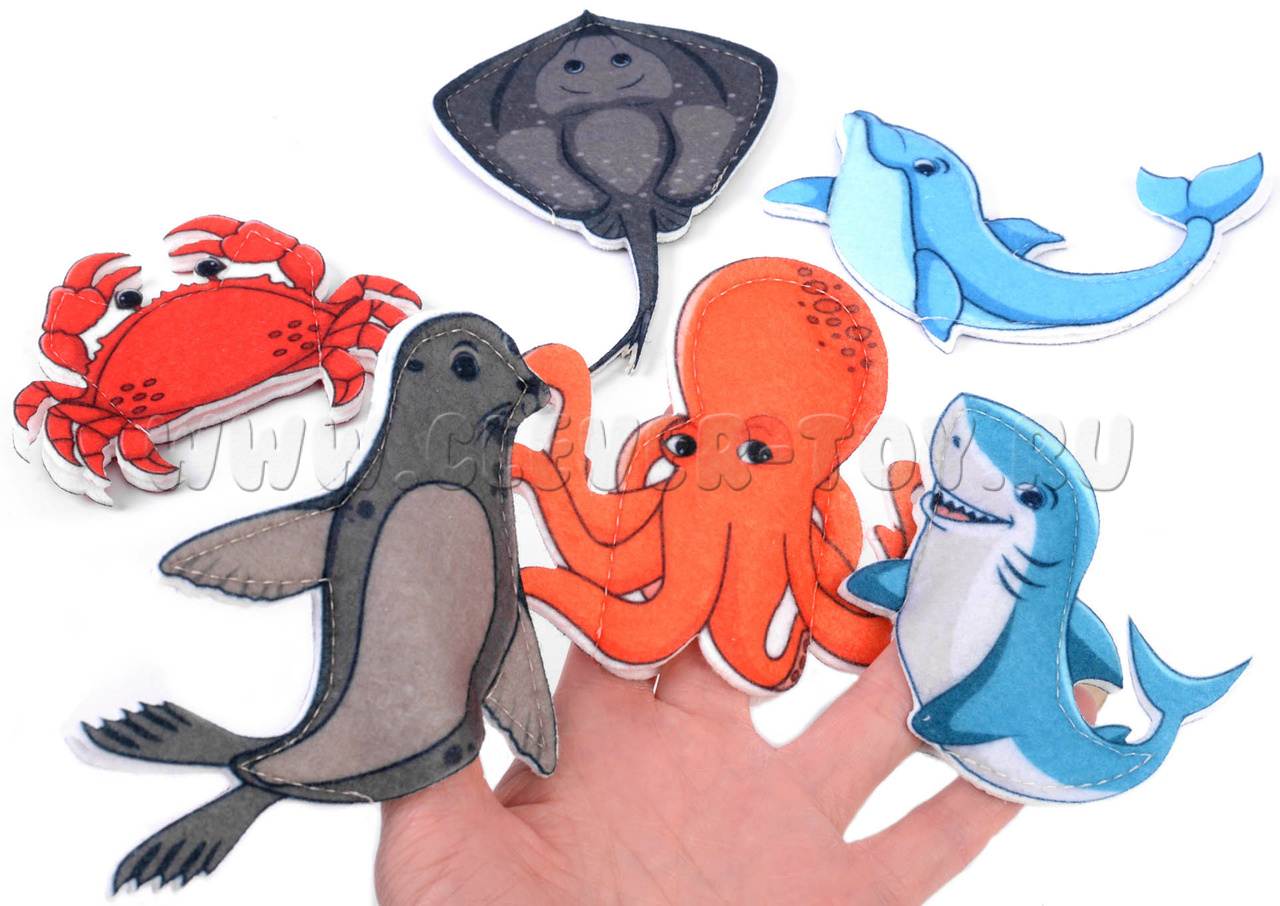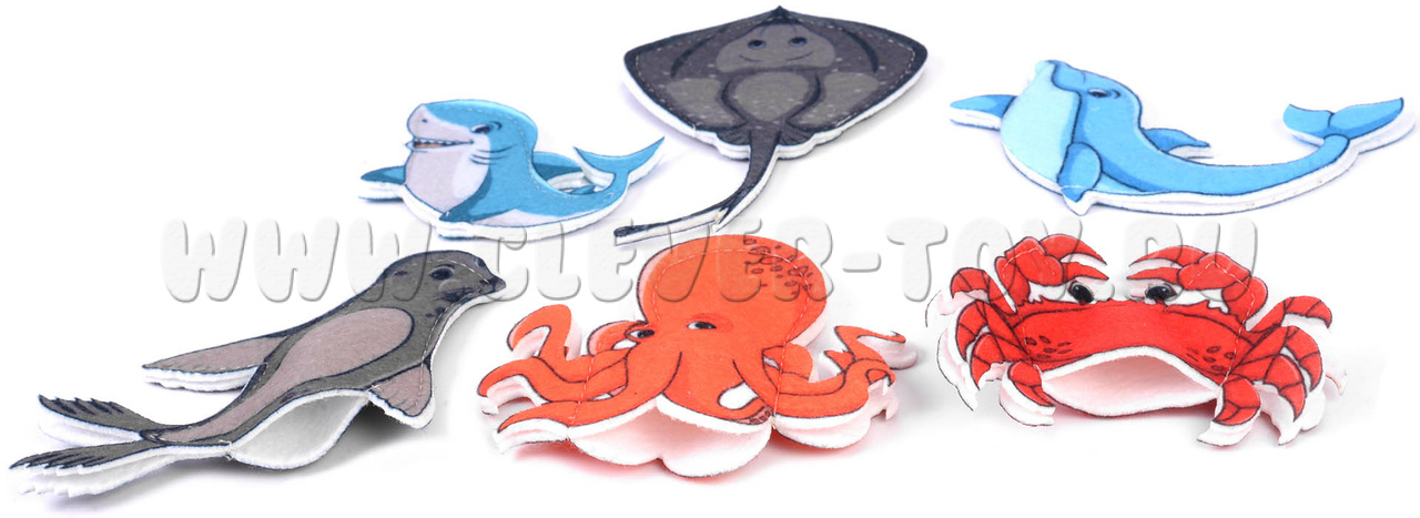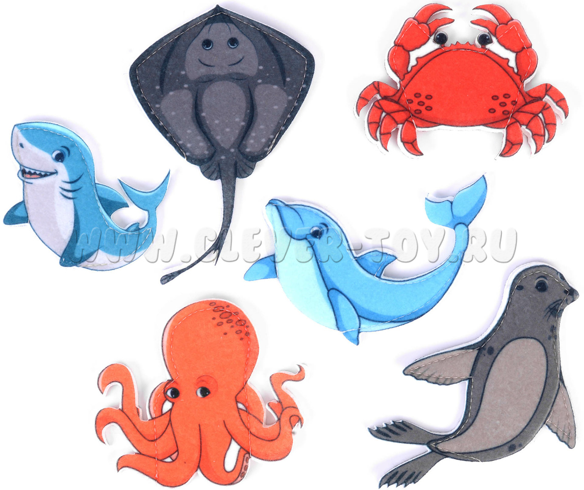 6 фигурок: Тюлень, акула, краб, скат, дельфин, осьминог.