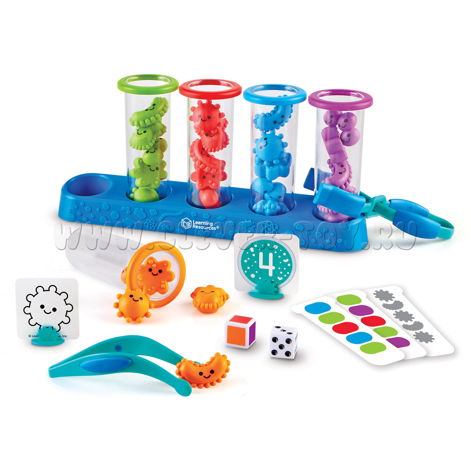 Миссия - спасти мир от микробов, отсортировав их в специальные пробирки. Для этого вооружимся пинцетом и хорошим настроением! Своими маленькими ручками малыш прикоснется к науке и научится различать цвета, цифры и формы.