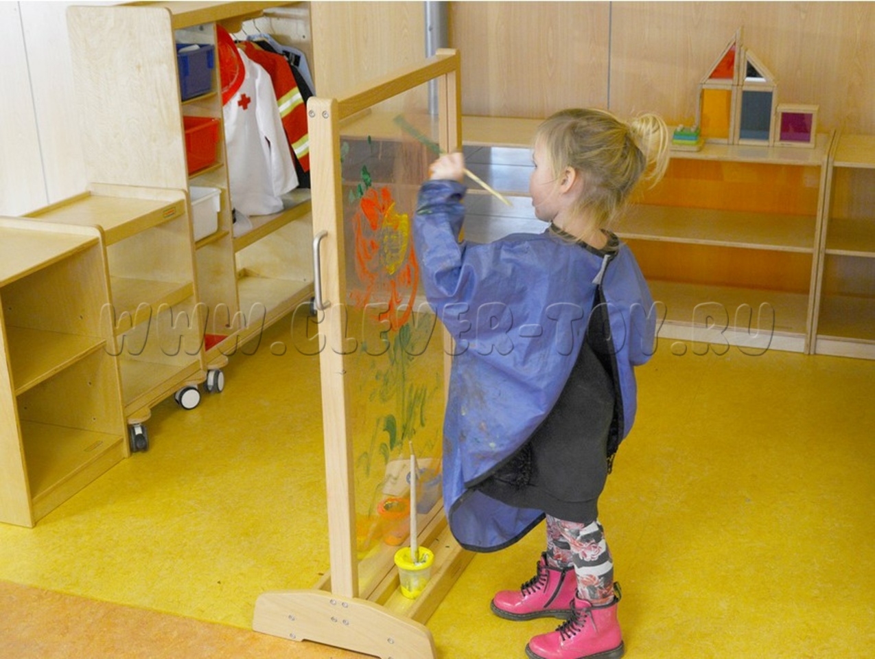 Поверхность для рисования сделана из прозрачного акрила, поэтому дети могут рисовать то, что видят сквозь него, в том числе портреты друг друга. После завершения работы рисунки можно просто стереть, чтобы использовать мольберт в следующий раз. Размеры мольберта позволяют рисовать стоя, создавая большие рисунки.